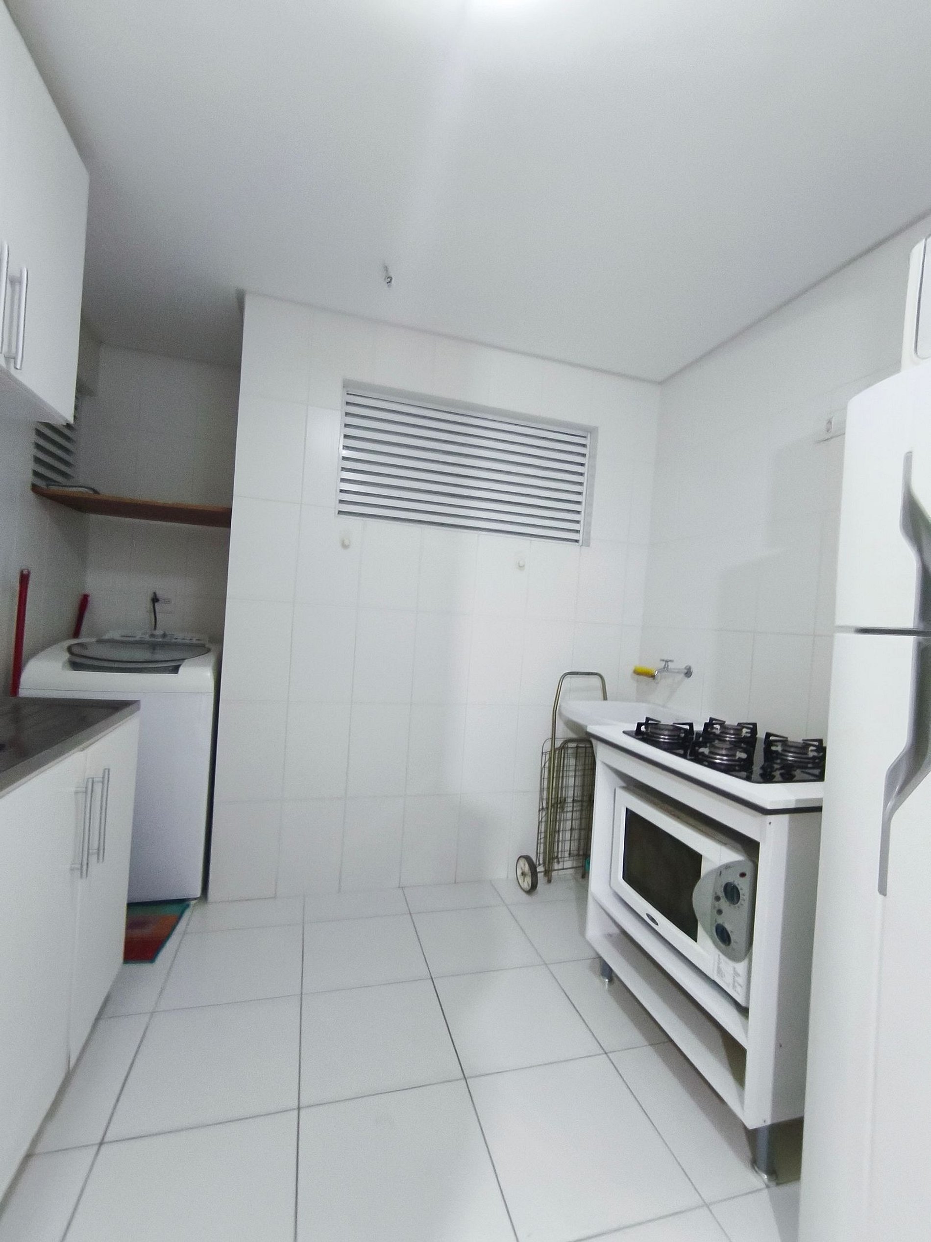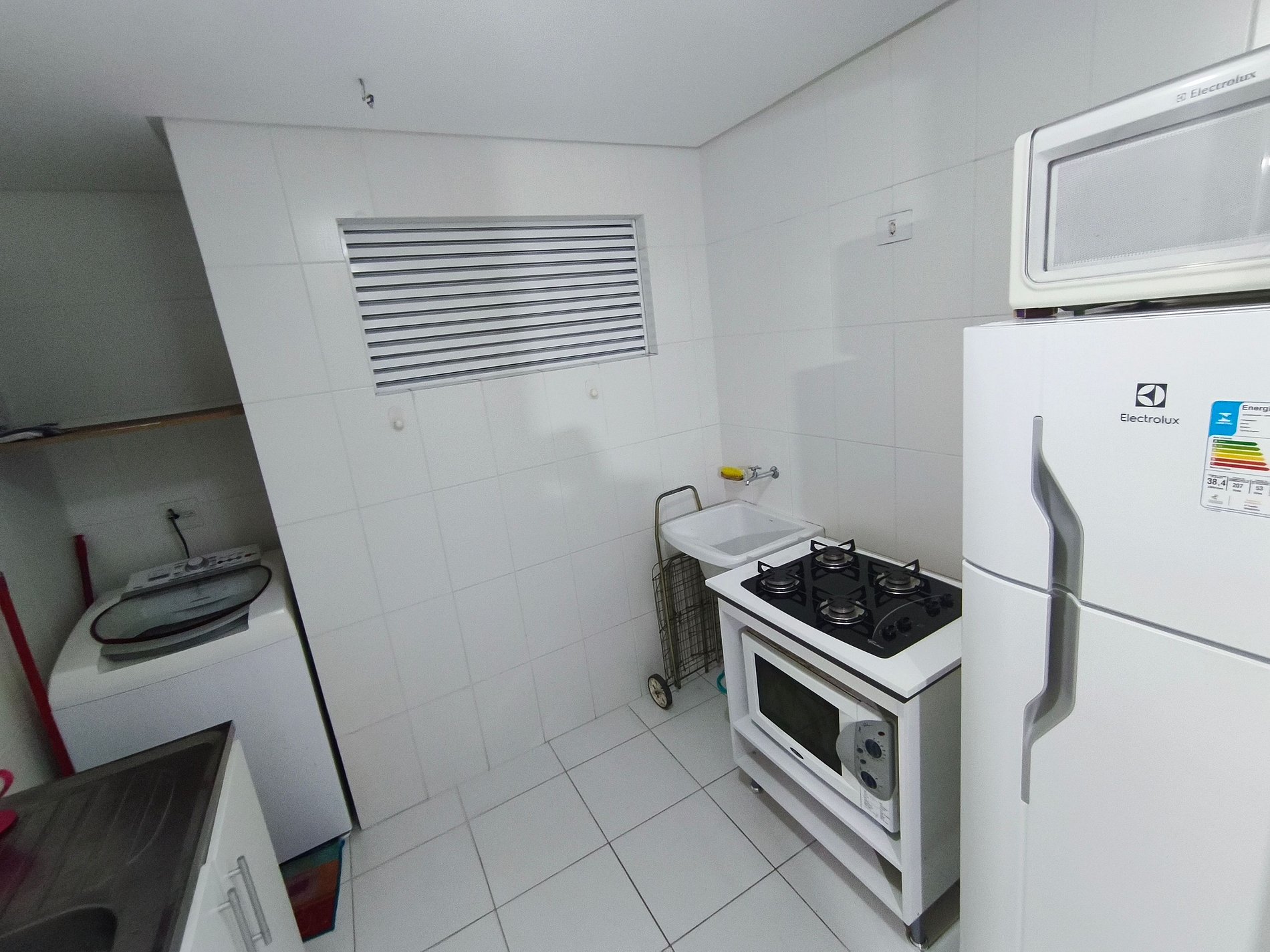 Eletrodomésticos: Fogão, forno, micro-ondas, geladeira e outros aparelhos para facilitar o preparo de refeições. N a sacada Churrasqueira a gás